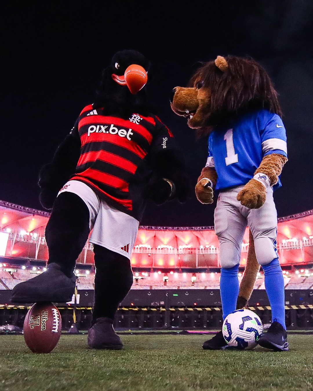 Nosso Urubão recebeu uma visita ilustre no Maraca! 🤩 O Roary, mascote do Detroit Lions, veio conhecer o templo sagrado do futebol e acompanhar de perto a chegada dos nossos craques para o jogo contra o Internacional 🏟️