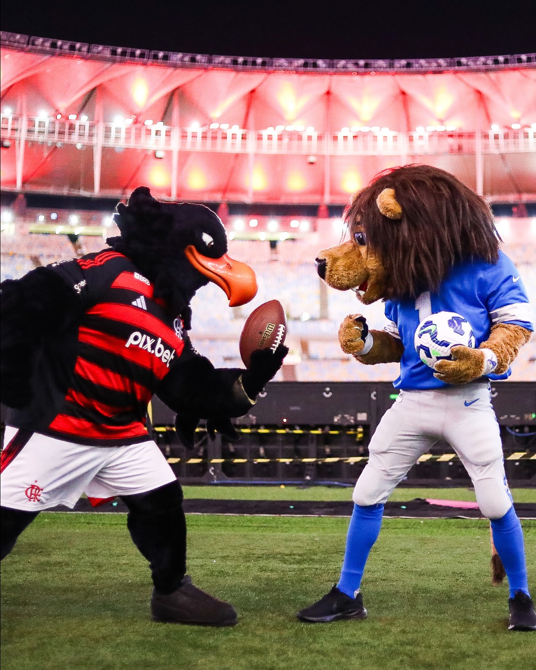 Our Urubão received an illustrious visit at the Maracanã! 🤩 Roary, the Detroit Lions mascot, came to experience the sacred temple of football and watch the arrival of our star players up close for the match against Internacional 🏟️